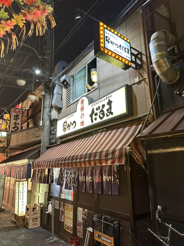 1차에서 먹었던 꼬치집에서 골목길에 있는 진짜 맛집으로 들어왔다. 꼬치집 바로 앞 건물에 사람 모형이 있었지만 당황하지 않았다. 여긴 오사카니까, 여기에 있는 모든 메뉴를 다 먹어본 것 같다.