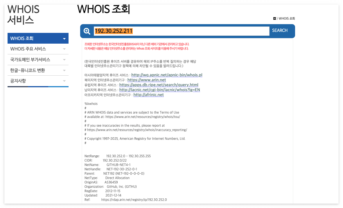 후이즈 도메인 검색에 IP 을 검색하면 호스트 정보가 나온다.