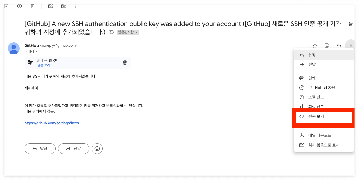 메일의 원본을 확인한다.