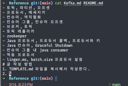 아래 예시와 같이 터미널에서  cat 으로 2개의 파일을  조회했을 때 파일간의 구별이 어렵다.